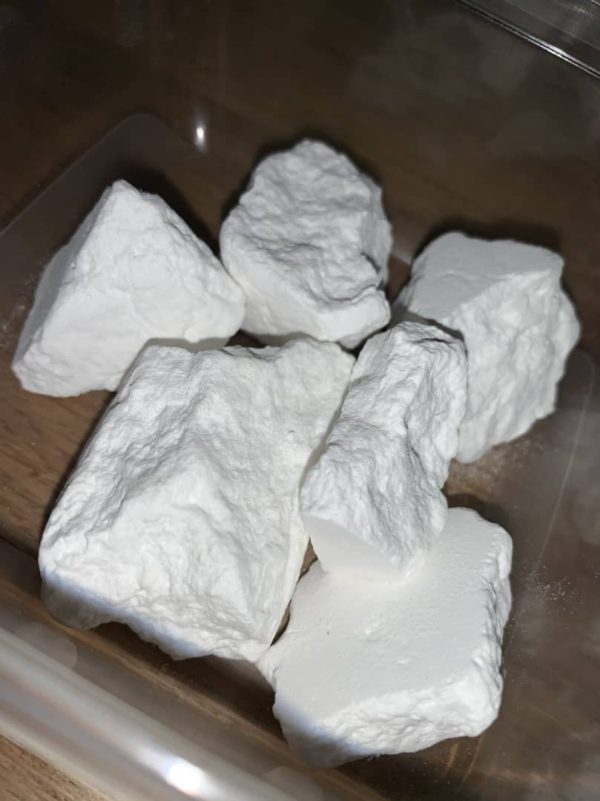 It comes in a few different forms. The most common is a fine, white powder. It can also be made into a solid rock crystal.